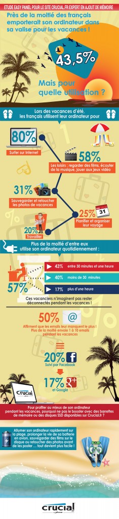 Selon une étude menée par Crucial.fr et l’institut EasyPanel, il apparaît que les Français qui emmènent leur ordinateur avec eux durant leurs congés d’été l’utilisent pour :